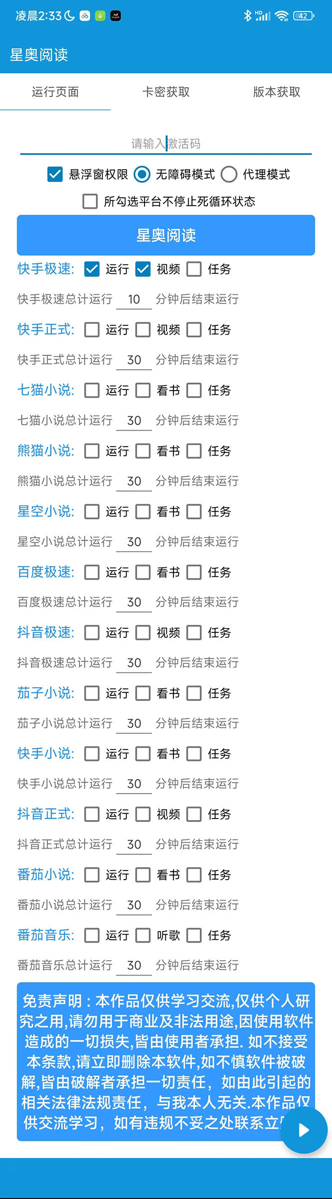 星奥阅读这款软件支持快手极速、快手正式、七猫小说、熊猫小说、星空小说、百度极速、抖音极速、茄子小说、快手小说、抖音正式、番茄小说、番茄音乐等多个平台,助手执行全自动挂机刷金币,开宝箱,看广告任务,单机多平台运行一天10-20+。