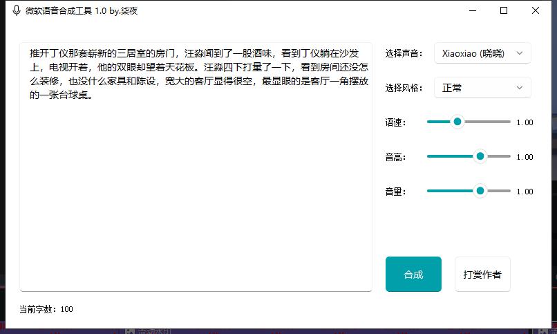 软件用的是微软语音的接口,支持不同的角色选择和不同的语音风格,可以调整语速、音高、音量。