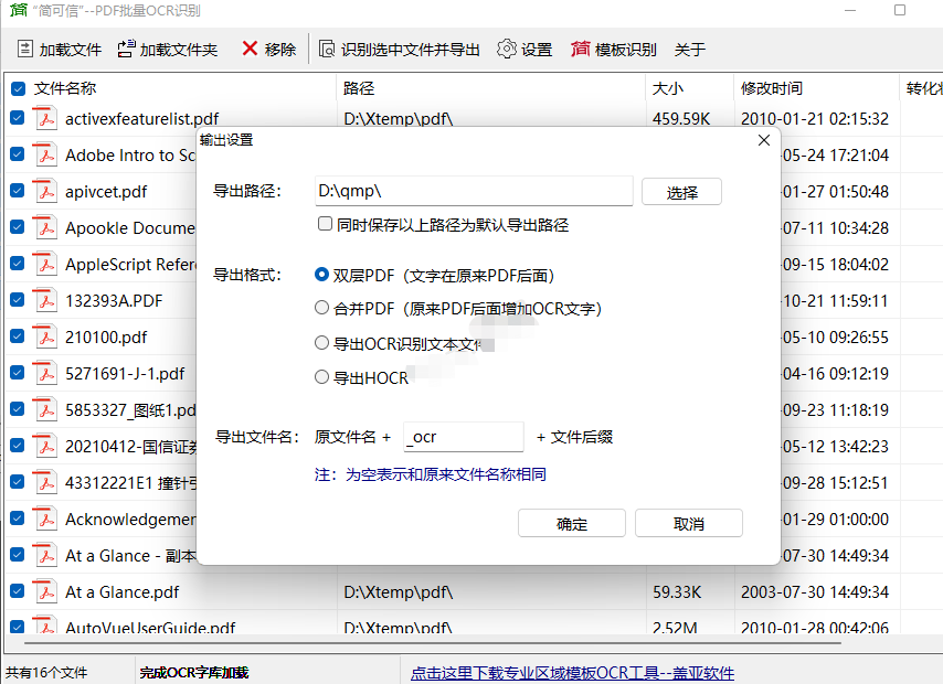 一个免费PDF批量OCR识别程序,可以同时对大量PDF文档进行OCR识别。将您的PDF文件转换为可编辑的文本,可以批量导出文件双层PDF等。 软件使用Tesseract5 API, 速度快,质量高,支持多线程处理。