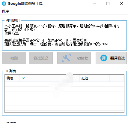 10月份,Google翻译API被误伤,官方干脆直接停用了。虽然网页翻译给停用了,但是API并没有停,稍微修改一下host就能解决;鉴于使用不方便,我做了一个小工具,自动获取可用的IP,并且选择一个最低延迟的IP,修改HOST,做到一键修复Google翻译功能。