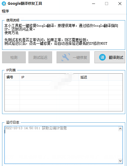 10月份,Google翻译API被误伤,官方干脆直接停用了。虽然网页翻译给停用了,但是API并没有停,稍微修改一下host就能解决;鉴于使用不方便,我做了一个小工具,自动获取可用的IP,并且选择一个最低延迟的IP,修改HOST,做到一键修复Google翻译功能。