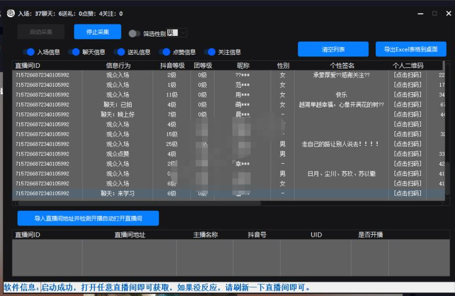 直播间ID,抖音等级,团等级,昵称,性别,个性签名,个人二维码,关注数,粉丝数,作品数,UID,抖音号,主页地址,认证V!