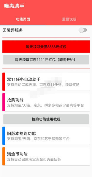 1、支持自动完成天猫/京东双11任务,自动领取奖励