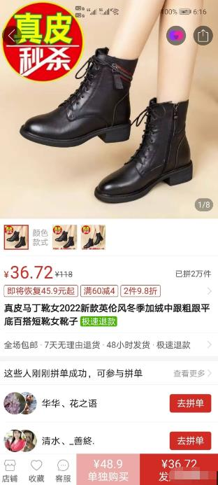 视频号小店的一款马丁靴售价203,去拼多多拿货价格36.同一个厂家生产的靴子。