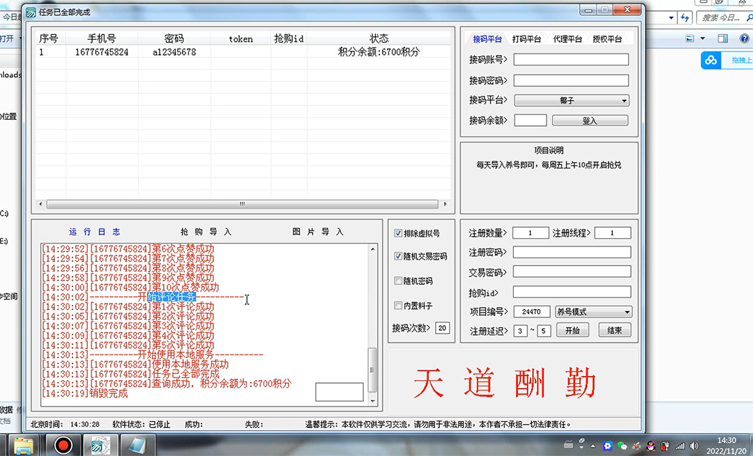 | 外面收费188.88开车的今日越城批量养号抢购协议项目, 项目主要是通过用软件去自动签到任务去获得每日积分,每周五可以抢购30话费,基本就是无脑操作,登录上以后,一个号1-2分钟,挂机就完事了。脚本支持批量养号抢兑功能 ,多号操作抢购中奖概率更高 当然,有能力的也可以自己去接单,去接代挂,帮别人代挂积分,基本接一单代挂就回本,外面不带抢购功能的手机软件都卖到88 设备需求:电脑 每天进行签到即可,每周五上午10点兑换,多号操作概率更高! 网盘内包含电脑版本软件及详细操作教程 另外额外赠送一个别人开发的手机端安卓版本养号脚本(无教程,自行测试) |