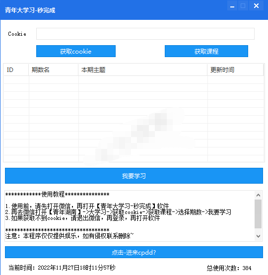 可以一键完成青年大学习,无语抓包获取Cookie,可以直接获取。同时本软件只支持【湖南学子】进行学习~