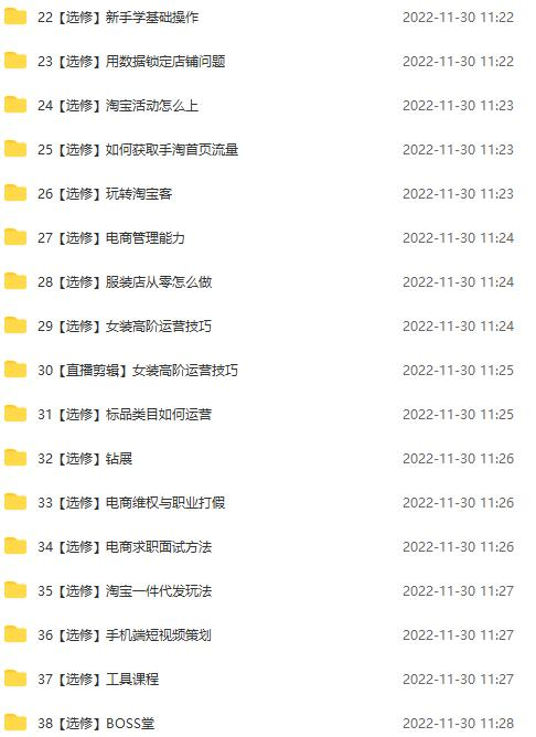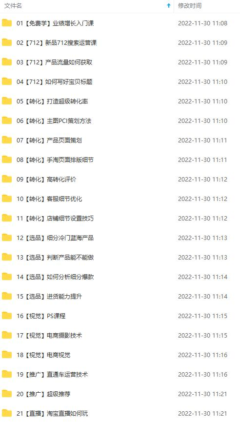 本套课程对于淘宝天猫推广讲的非常细致,从如何获取流量、产品策划、短视频的策划、手淘页排版细节、高转化评价、客服细节优化、对产品的ps以及摄影、电商视觉等都做了详细的讲解,后面讲到直通车运营技术生意参谋钻展等一套完整的天猫业绩增长课程值得去看。