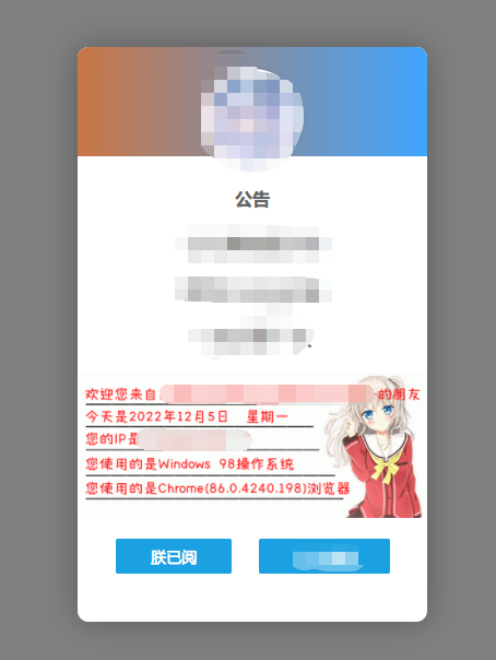网站弹窗公告源码,把index里面的文件加在需要弹窗的地方,记得还有其他文件也要复制到根目录,使用cookie记录一天只弹一次。