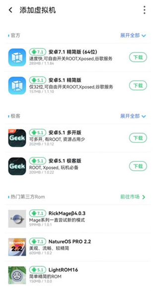 【ROM平台】Android 7.1、5.1版本的ROM系统版本。支持拥有多台虚拟机