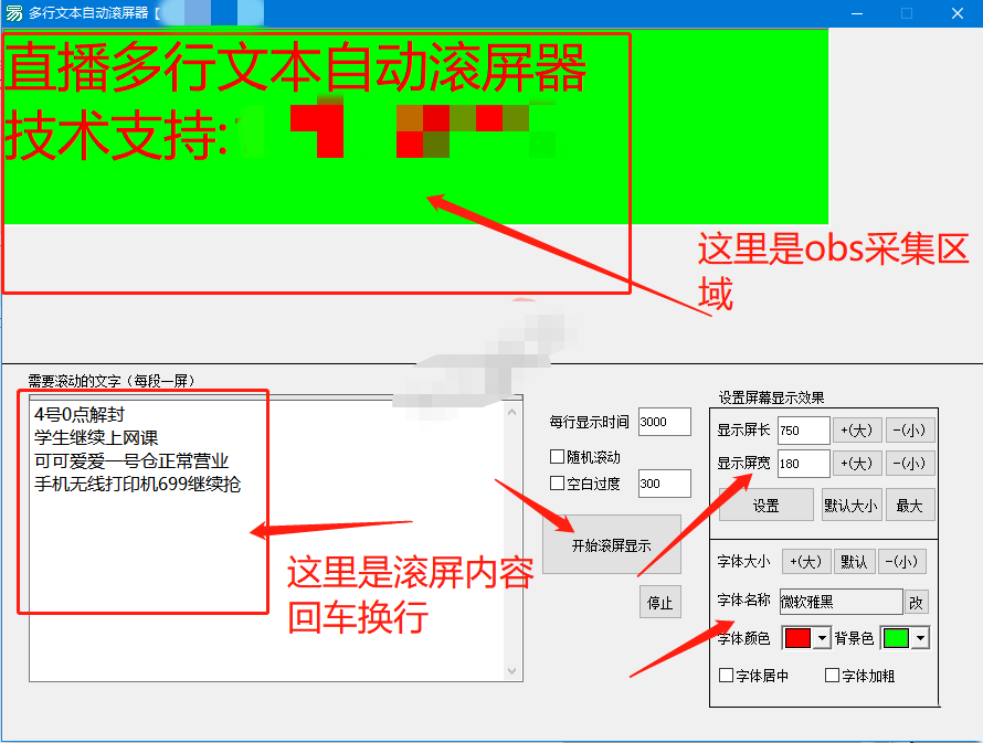 用于直播时多行文本自动滚屏显示。使用方法非常简单,直接点击开始就行了,设置的颜色,字体、屏幕大小等东西都在右下角,一看都懂,不再一一介绍。