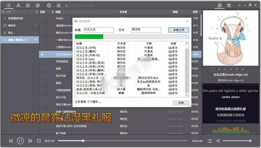 foobox内部集成了歌词显示,默认自动获取,搜索不出来可以手动搜索。