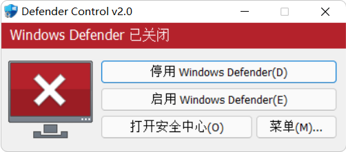 我们在安装杀毒软件时,经常会与系统自带的软件起冲突,并且微软公司的这款软件隐藏的也比较的深,您想要进行关闭都不知道在哪儿进行关闭,为此,使用这款Defender Control软件即可对Windows Defender快速关闭,非常简单好用。