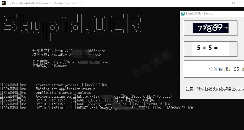 ython开发,调用Fastapi+DDDDocr,pyinstaller打包为exe,文件暗大(训练模型也一起打包了大约200M)方便快捷爬虫开发。封装DDDDOCR到Fastapi,支持本地调用和部署服务器HTTP协议调用,会HTTP协议就能用,支持通用字母,数字,汉字验证码识别,算术验证码识别。