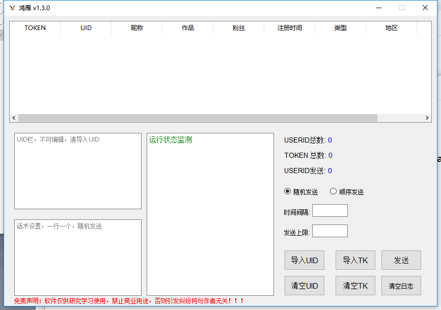 2、进入软件后,导入tk、导入UID、设置话术、设置发送间隔和发送次数。
