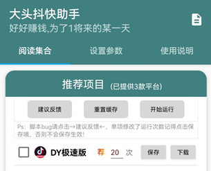 (3547)安卓大头抖快助手_V1.2 抖音+快手+今日头条自动阅读脚本 手机工具/软件 23年1月8日 编辑 前往下载 船长乃歌 取消关注 关注 私信 一个软件,三个平台通用。抖音+快手+今日头条自动阅读脚本 下载权限查看 ¥ 免费下载 评论并刷新后下载 登录后下载 查看演示 {{attr.name}}: 您当前的等级为 登录后免费下载登录 小黑屋反思中,不准下载! 评论后刷新页面下载评论 支付¥以后下载 请先登录 您今天的下载次数(次)用完了,请明天再来 支付积分以后下载立即支付 支付以后下载立即支付 您当前的用户组不允许下载升级会员 您已获得下载权限 您可以每天下载资源次,今日剩余次 1.清辉网不销售除【会员服务】之外的任何物品 2.单个内容付费只是清辉网整理服务费用,内容为免费分享 3.本站的任何内容仅限于学习,请勿用于违法领域,违者自行承担一切责任 实用工具
