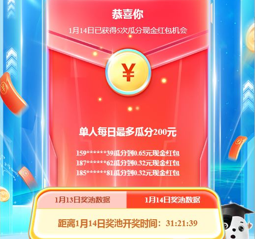 5次自动答题完成后,就可以获得到5次的抽奖次数,可在次日10点进行抽奖,奖励红包直接到微信,单人每日最高可瓜分得200元。