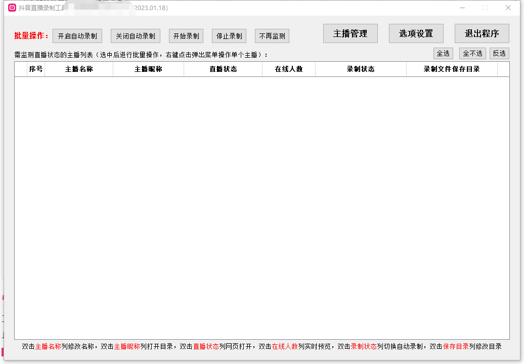 在下方文本框中粘贴抖音APP主播主页复制出的完整链接(可以多个,无需分隔)或直接输入短链接字符(现为7位字母数字,可以多个,只能一行一个)或网页版直播页面以https://live,douyincom/XXX(XXX为数字形式的WebRid)开头网址或用户页面以https://wdouyn.con/user/XxXX开头的网址(XXM为用户Sec Tid,此两种方式添加只能一行-个行首不能有其它字符)后点击“新增主播”按钮·除网页版直间接外均Cokie才能添加,Cookie自动设置