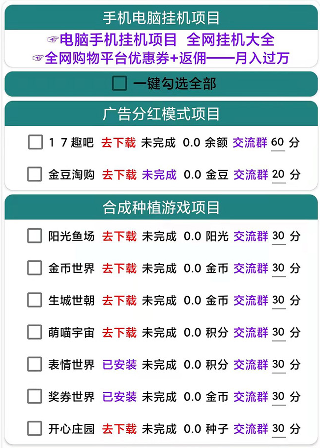 把卷轴脚本以及其他脚本合集在一起了,详细看图,较火的小游戏项目:奖券世界、表情世界、开心庄园,较火的卷轴项目:蚁丛旅游、旅游联盟。