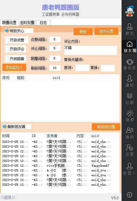唐老鸭跟圈版是电脑版的微信定时跟圈、发圈,以及定时群发、营销助手。操作比较简单、明了,很容易上手。目前唐老鸭跟圈版需要安装电脑微信3.6版本。