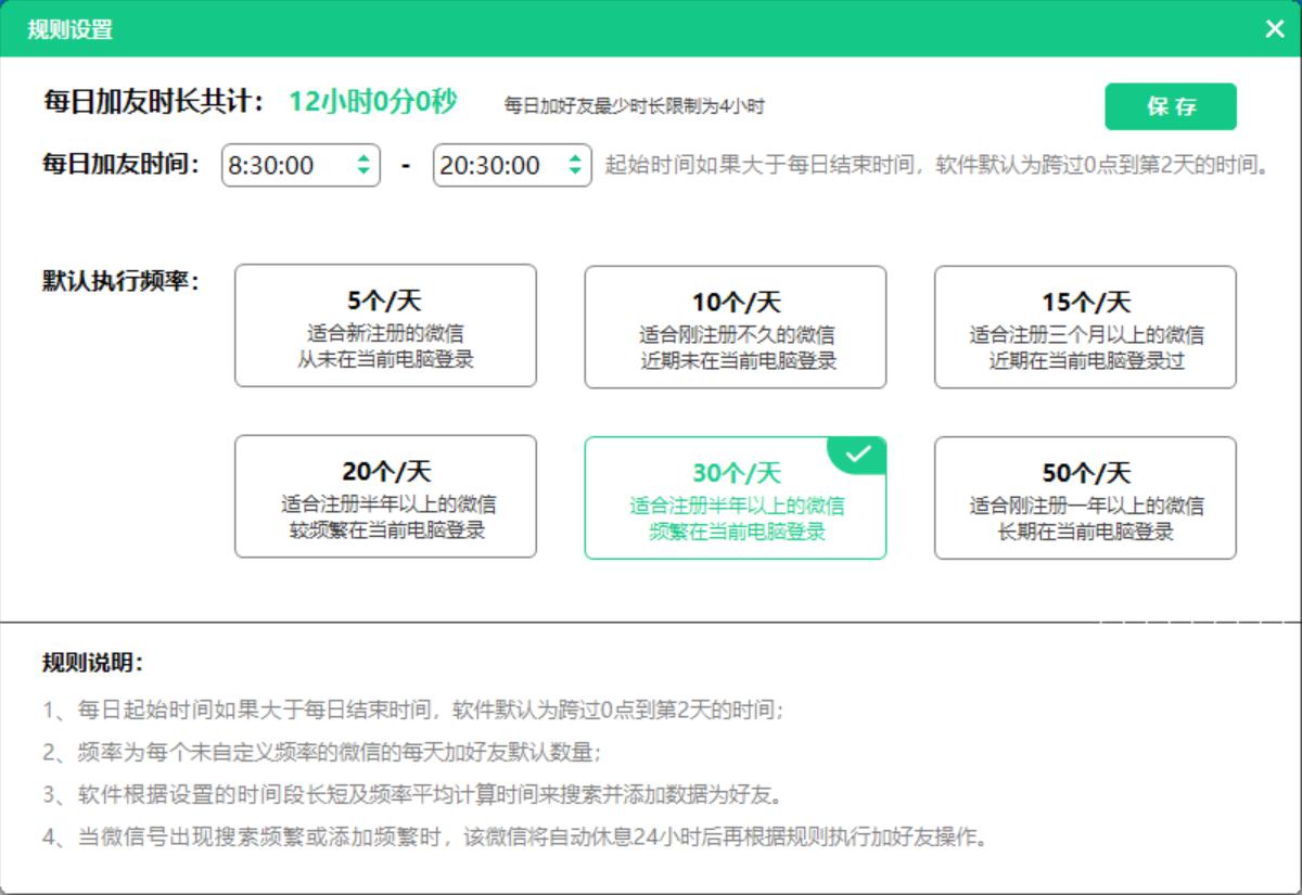 支持设置加好友规则,如什么时间段添加和添加的频率